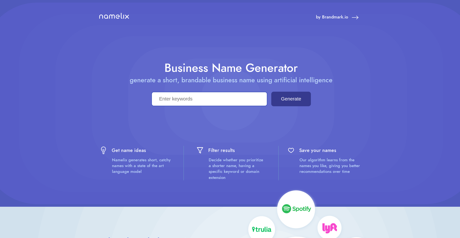 Namelix helps start-ups and businesses generate memorable, unique, and less expensive brandable names. It utilises state-of-the-art machine‐learning models to provide suggestions based on filters, style and preferences.