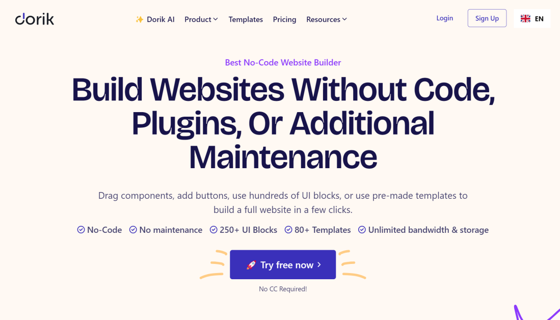 Dorik is a no-code website builder that provides simplicity, speed and flexibility for users. It enables them to create business sites, landing pages, portfolios and web apps without prior coding experience. By using a drag-and-drop editor, custom domains, and integrations, users can instantly create websites that suit their taste and brand.